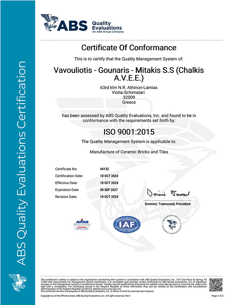 The company is constantly seeking quality,follows all advancements of technology and continuously modernizes its facilities.This is the reason it has obtained and implements ISO 9001:2015 και ISO 14001:2015 Quality Management System for the design and production of its products.
